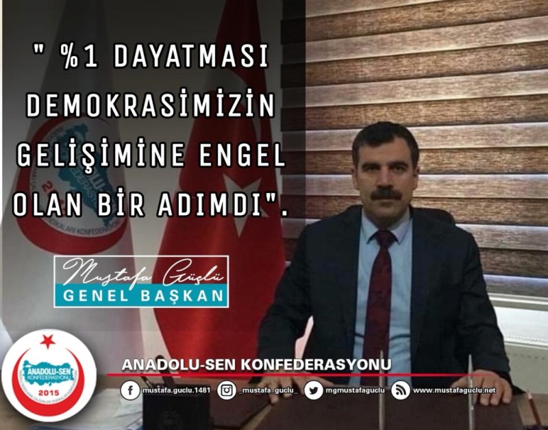 Son yapılan 6. Dönem Toplu Sözleşmede, yetkili konfederasyon Memur Sen tarafından masaya getirilen ve mutabakata varıldıktan sonra da alelacele yürürlüğe konulmak istenen, %1 örgütlenme barajı, sendikal demokrasimizin gelişimi açısından çok talihsiz bir süreç olarak Türk sendikacılık tarihine kara bir leke olarak sürülmüştür. Yine Toplu Sözleşme masasının tarafı olan Kamu Sen tarafından da baraj konusunun desteklenmesi sendikacılık tarihimize talihsiz bir not olarak düşülmüştür. Toplu Sözleşme masasında alınan ve kamusal vicdanları sızlatan, sosyal adalete karşı duran bu kararla, bir yandan memurların sendika sendikasız olarak ayrımcılığa tabi tutulması bir yandan da sendikalı olan memurların baraj altı ve üstü sendikalı diyerek ötekileştirilmesi, çalışma huzurunu ve düzenini bozacak bir gelişme olmuştur. Bu girişime bağımsız Türk yargısının önemli bir kurumu olan Danıştay tarafından dur denilmiştir. Bu önemli gelişme sonrasında, çalışma hayatında örgütlenme özgürlüğü açısından rekabete dayalı hareketli pozitif günler yaşanacaktır; aynı zamanda ise ülkemizde demokrasi, katılımcılık ve çoğulculuk adına umutlar yeşermiştir. Biz Anadolu Sen Konfederasyonu olarak Memur Sen ve Kamu Sen'in sendikal demokrasinin önüne koymaya çalıştığı engelleri teker teker temizleyerek hedefimize ulaşacağımızı ifade ederek, bu vesile ile tüm kamu çalışanlarını beraberce mücadele etmeye davet ediyoruz.