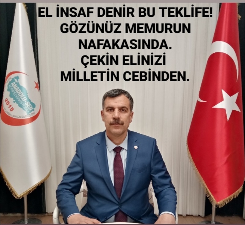 EL İNSAF DENİR BU TEKLİFE, ÇEKİN ELİNİZİ MEMURUN CEBİNDEN! Memur Sen Genel Merkezinin düzenlemiş olduğu 10.Yılında Toplu Sözleşme Kongresinde konuşan Genel Başkan Ali Yalçın “Sendikalı olmayı teşvik etmeyen, yetkili sendika üyesi olmayı da önemsizleştiren bu sendikal düzen değişmeli, dayanışma aidatı mutlaka kanuna girmelidir” dedi. Şimdi kendisine şu soruları yöneltiyorum: Acaba memurları sendikalı olmaya sendikal rekabetin olduğu bir ortam teşvik etmez mi? Bu çerçevede memurların istediği sendikaya üye olmasını sendikal mobing ile engelleyen bazı kurum yöneticilerinin bu keyfi tutumuna dur diyecek olan e-devlet üzerinden sendikalı olma hakkının memura verilmesi hususunda ne düşünüyorsunuz? Niçin bu konuda hiç bir açıklama yapmıyorsunuz? Sayın Cumhurbaşkanı Yardımcısı Fuat Oktay’ın bundan bir yıl önce işçilerde olduğu gibi memurlara da e-devlet üzerinden sendika üyesi olma imkanı sağlayacak bir düzenleme üzerinde çalışıyoruz demesine rağmen bu konuda bir gelişme olmadığı ortada iken dile getirilen bu çalışmanın bir an önce hayata geçirilmesi için yetkili konfederasyon olarak niçin hiç bir girişimde bulunmadınız ve halen de bulunmuyorsunuz? Acaba mevcut durumun lehinize mi olduğunu düşünüyorsunuz? Tüm bunlar ayan beyanken sendikalı olmayı hızlandıracak, sendika tercihinde demokratik bir ortam doğuracak bu adımı desteklemeyeceksiniz, daha sonrada sendika yasasının sendikalı olmayı teşvik etmediğinden yakınacaksınız. Bu tavrınız size hiç inandırıcı ve samimi geliyor mu? Ayrıca 10 yıldır yetkili konfederasyon olarak katıldığınız hangi toplu sözleşme masasında enflasyonun üzerinde zam aldınız da size üye olmayan memurlardan toplu sözleşmede onları layıkı ile temsil etmiş gibi dayanışma aidatı istiyorsunuz? Sizin dayanışma aidatı isteğinizi duyan sanki toplu sözleşme masasında enflasyonun üstünde zam alarak memurun refahtan payını almasına katkı sunduğunuzu zannedecektir? Siz bu talebinizin adilane olduğuna gerçekten inanıyor musunuz? Şimdi size söyleyeyim dile getirdiğiniz “Sendikalı olmayı teşvik etmeyen, yetkili sendika üyesi olmayı da önemsizleştiren bu sendikal düzen değişmeli, dayanışma aidatı mutlaka kanuna girmelidir” ifadeniz milyonların üzerinde üyeye sahip bir konfederasyon olarak toplu sözleşmede hiç bir şey elde edememenizin günahını sendika yasasının yetersizliğine bağlayarak kendi acziyetinizi ve iş bilmezliğinizin üzerini örtmeye çalışmaktan başka bir şey değildir. Bu adaletsiz talebiniz tıpkı uygulamaya koymaya çalıştığınız ancak yürütmesini Danıştay’ın durdurduğu sendika barajı isteğinizin kopyası olduğunu hatırlatarak sizleri adaletli davranmaya davet ediyoruz. MUSTAFA GÜÇLÜ ANADOLU SEN GENEL BAŞKANI